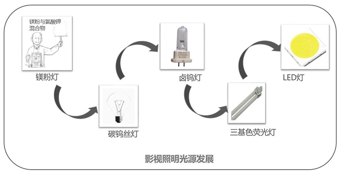 在攝影及影視照明行業(yè)的發(fā)展進(jìn)程中,由最早的鎂粉燃燒產(chǎn)生的光亮來作為補(bǔ)光,到愛迪生的鎢絲燈,